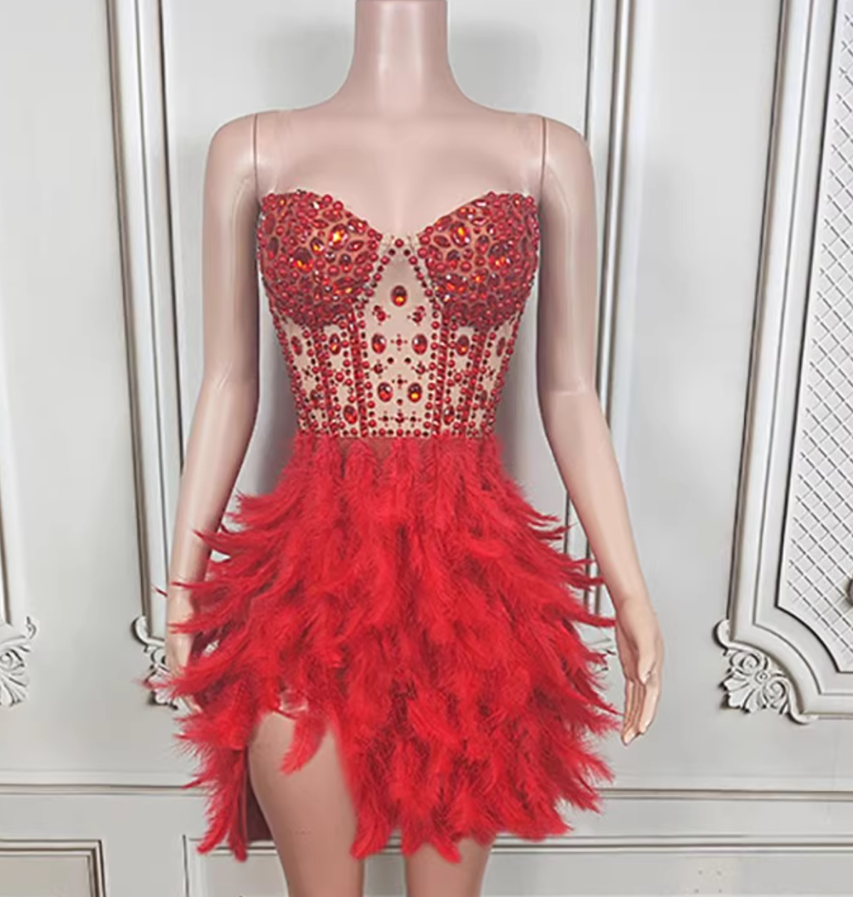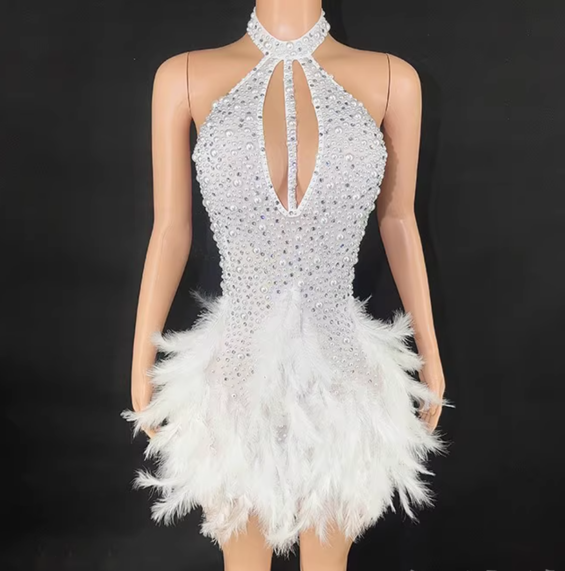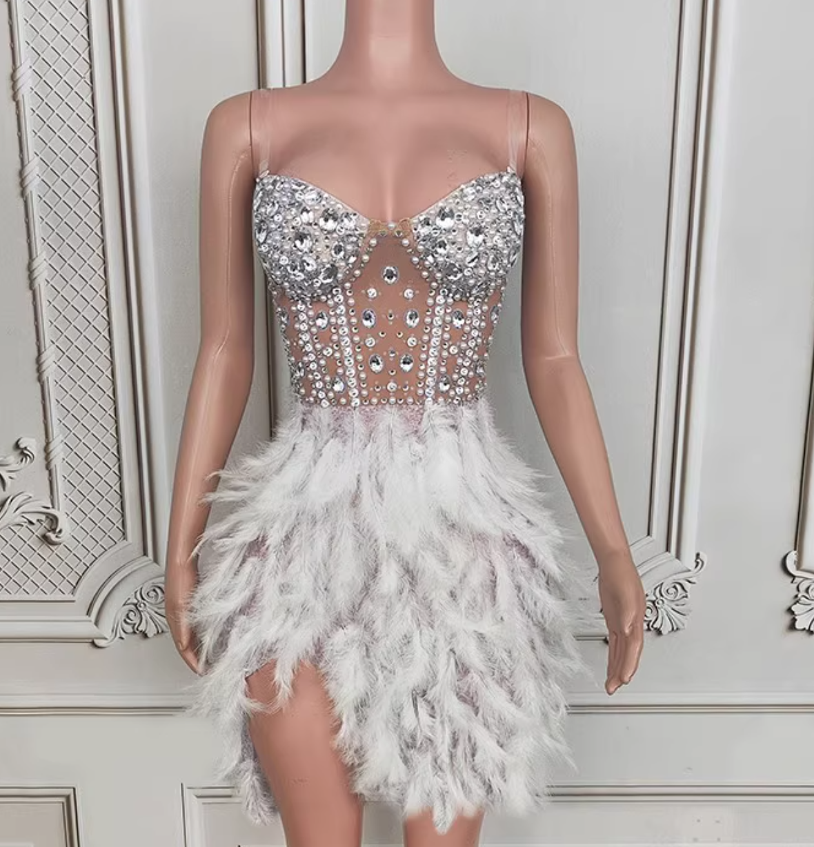- This beautiful ball gown is made with sparkly rhinestones and feathers details, very elegant.
